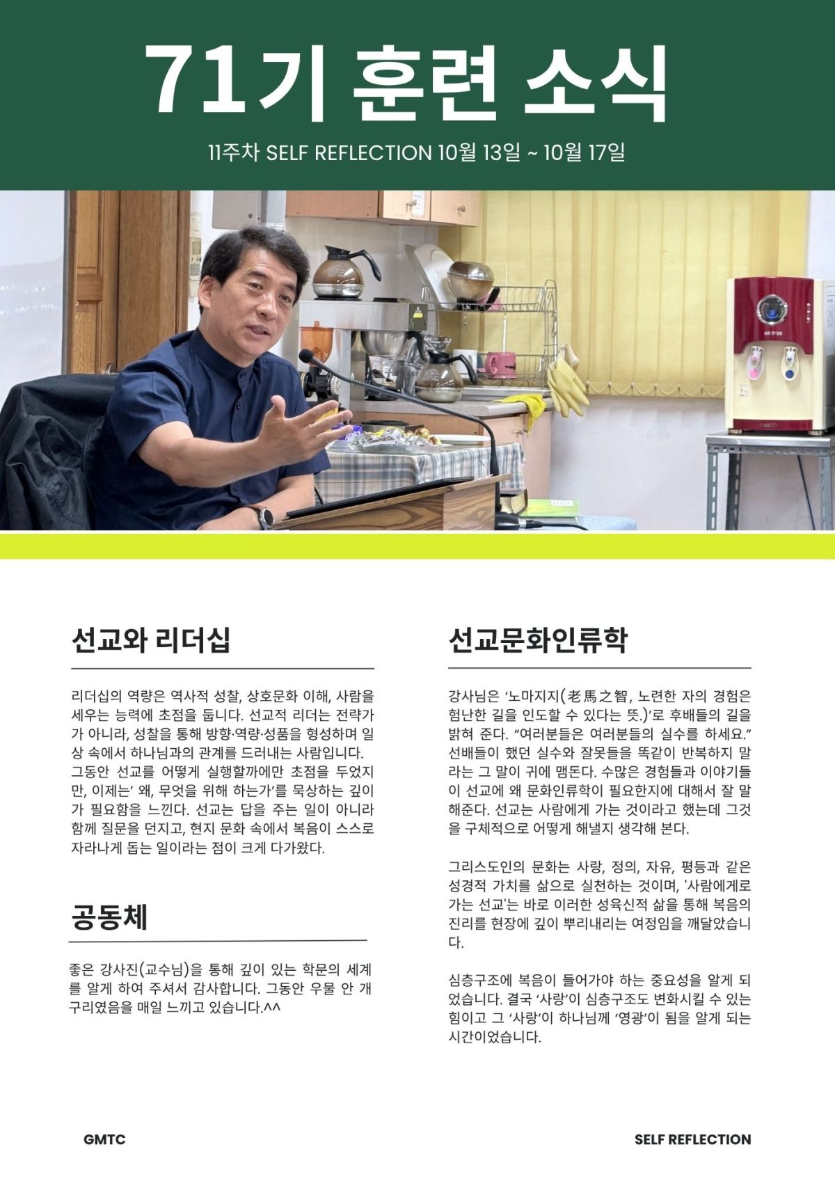 선교와리더십, 선교문화인류학, 공동체 생활에 대한 SELF-REFLECTION 소식이 왔습니다.