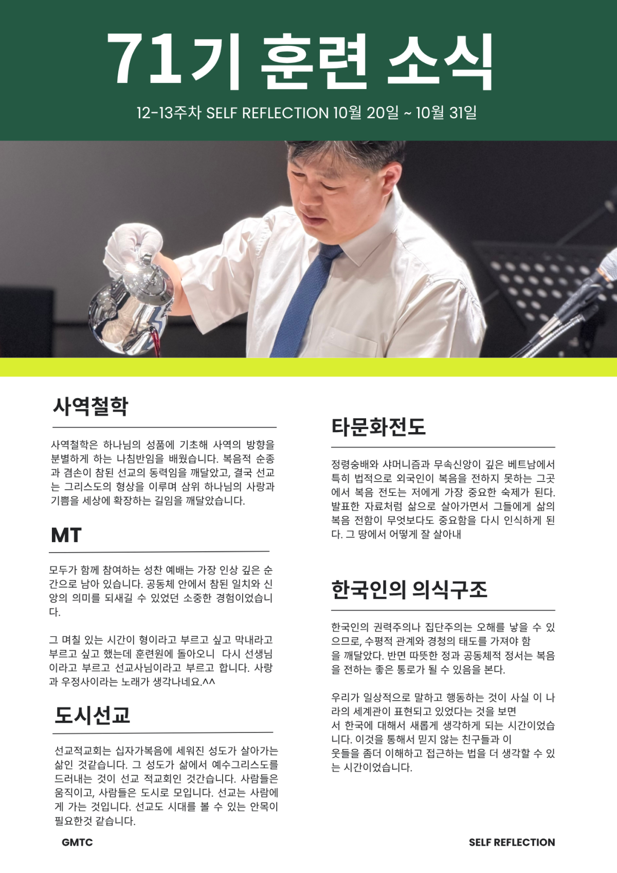 도시선교, 타문화전도, 한국인의 의식구조, 공동체 생활에 대한 SELF-REFLECTION 소식이 왔습니다.